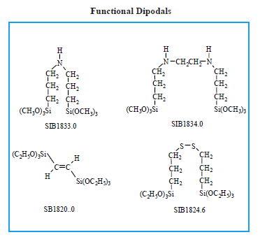 产品作用: 改进润湿附着力;提高耐化学性;耐水解性较高,是传统硅烷的10000倍以上;提高机械强度和改善物质的表面性质。 1.2 作用机理 Dipodal的硅烷偶联剂的作用机理与传统硅烷偶联剂相同,硅氧烷基水解与基材表面的羟基发生化学结合。 2、产品种类 产品分为含有与有机物能够进行化学反应性官能团和不含有反应活性的官能团两种硅烷偶联剂。